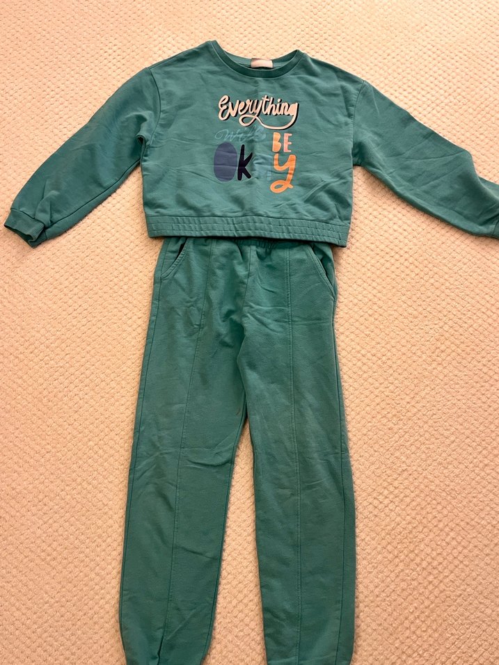 Yeşil renkli kız eşofman takımı, bol kesim, uzun kollu ve bisiklet yaka. Yumuşak sentetik kumaştan, düğme detaylı, pastel renkli ve baskılı tasarıma sahip.