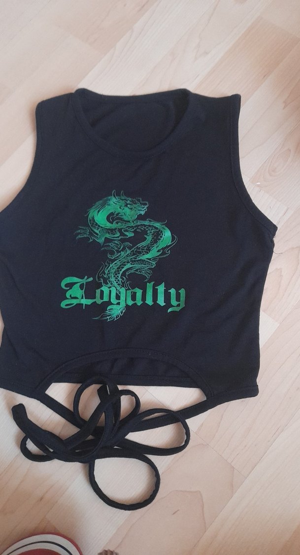 Bu dar kesim, kolsuz mini atlet, yumuşak sentetik kumaş üzerine koyu yeşil ejderha baskısı ve 'Loyalty' yazısı içerir. Yuvarlak yakalı ve etek kısmında bağcık detayı bulunur.