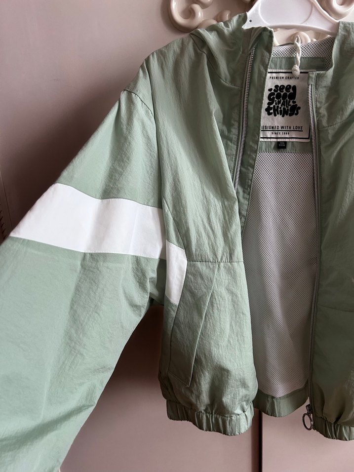 Sentetik kumaştan, yüksek yakalı, uzun kollu, fermuarlı, pastel yeşil baskılı bol kesim kadın midi ceketi. Onun için almıştık çok tatlı bir rengi var o kadar az kullandı ki. Ürünü Almanya’da almıştım . yağmurluk niyetiyle kullanılır. Hiçbir deformasyonu yoktur çok az kullanıldı