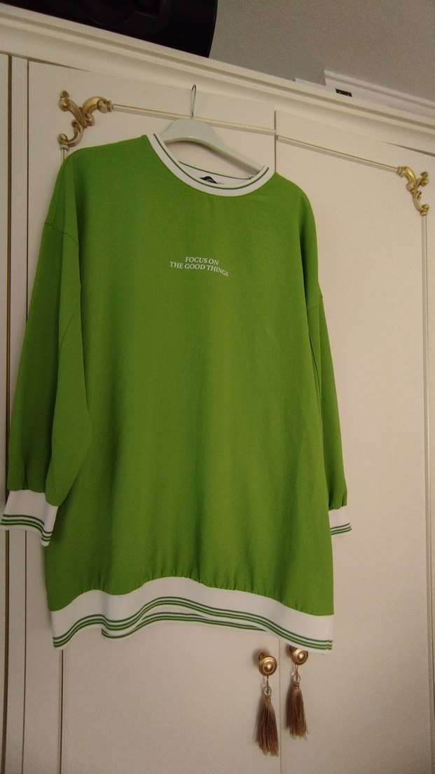 Yeşil pamuklu sweatshirt, yuvarlak yaka ve uzun kolludur. Oversize kesimi ve baskılı yazısı ile rahat sokak stiline uygundur. Manşet ve etek kısmında çizgili detaylar bulunur.