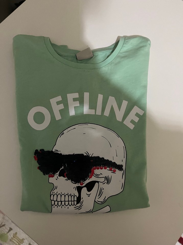 Yeşil renkli, gevşek kesim erkek tişörtü. Bisiklet yaka ve kısa kollu, baskılı kafatası ve "OFFLINE" yazısı bulunur. Yumuşak sentetik kumaştan yapılmıştır.