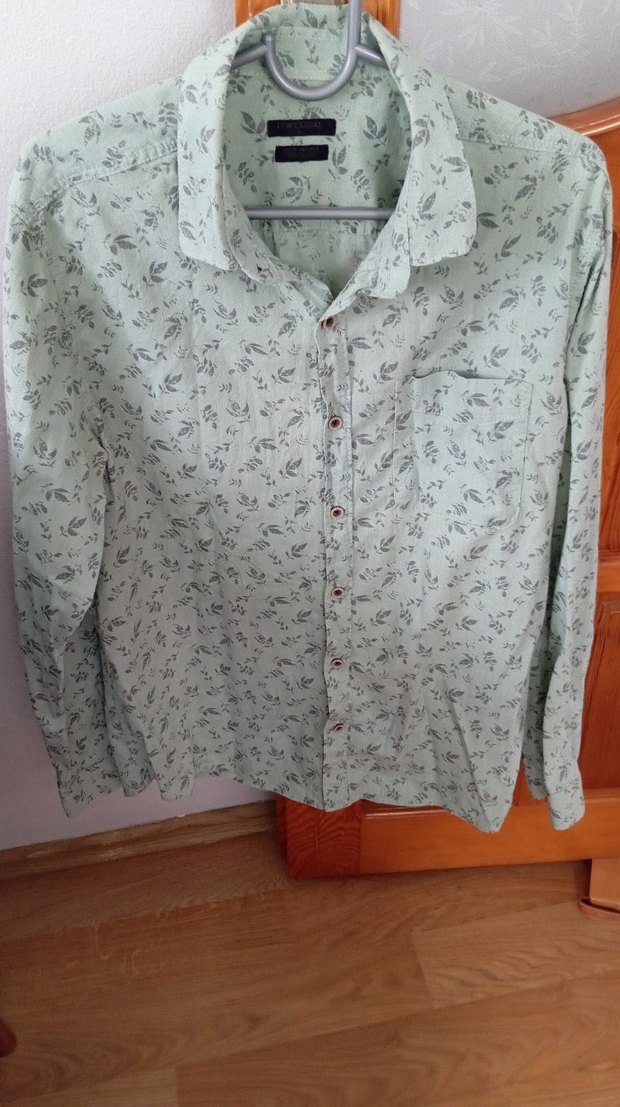 Yeşil renkli, baskılı pamuklu kumaştan yapılmış, yakalı ve düğmeli uzun kollu erkek gömleği. Rahat kesimiyle günlük sokak stiline uygundur.