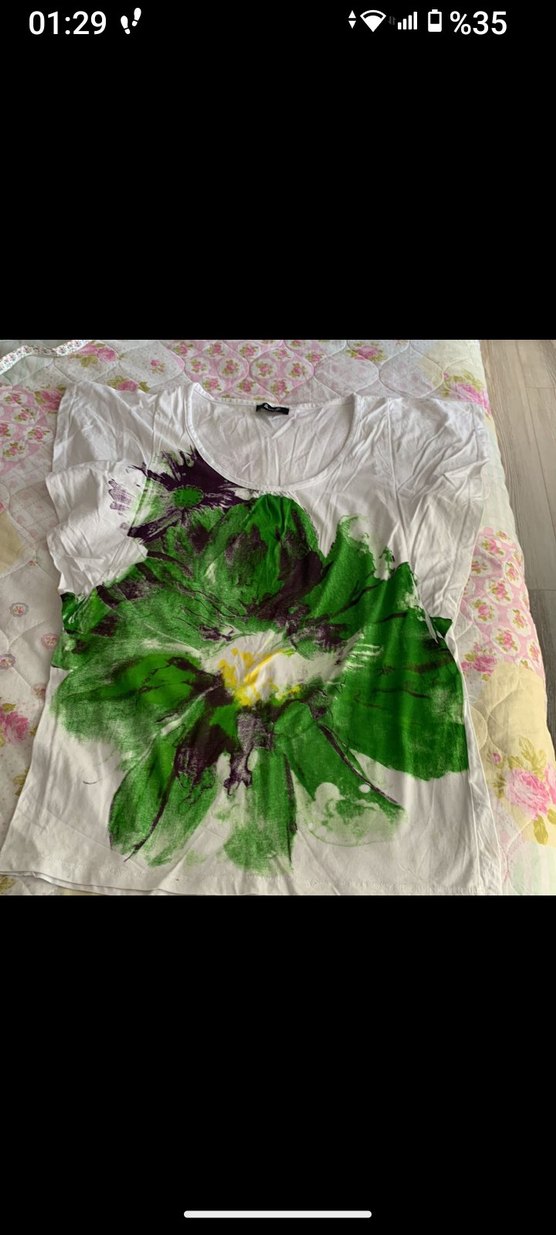 Yeşil baskılı büyük çiçek desenli, kısa kollu, yuvarlak yaka, rahat kesim kadın tişörtü. Günlük kullanıma uygun yumuşak kumaş.
