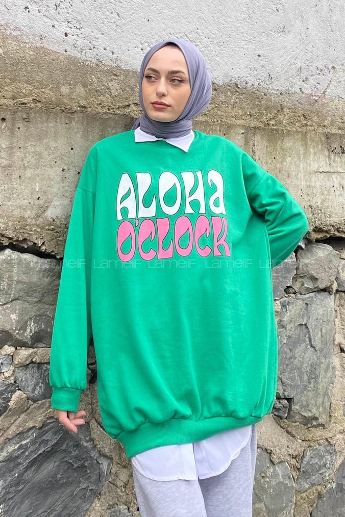 Yeşil renkli, uzun kollu, bisiklet yaka ve bol kesim kadın sweatshirt. Pastel renkli "ALOHA OCLOCK" baskısı ve yumuşak, örme kumaştan günlük kullanıma uygun.