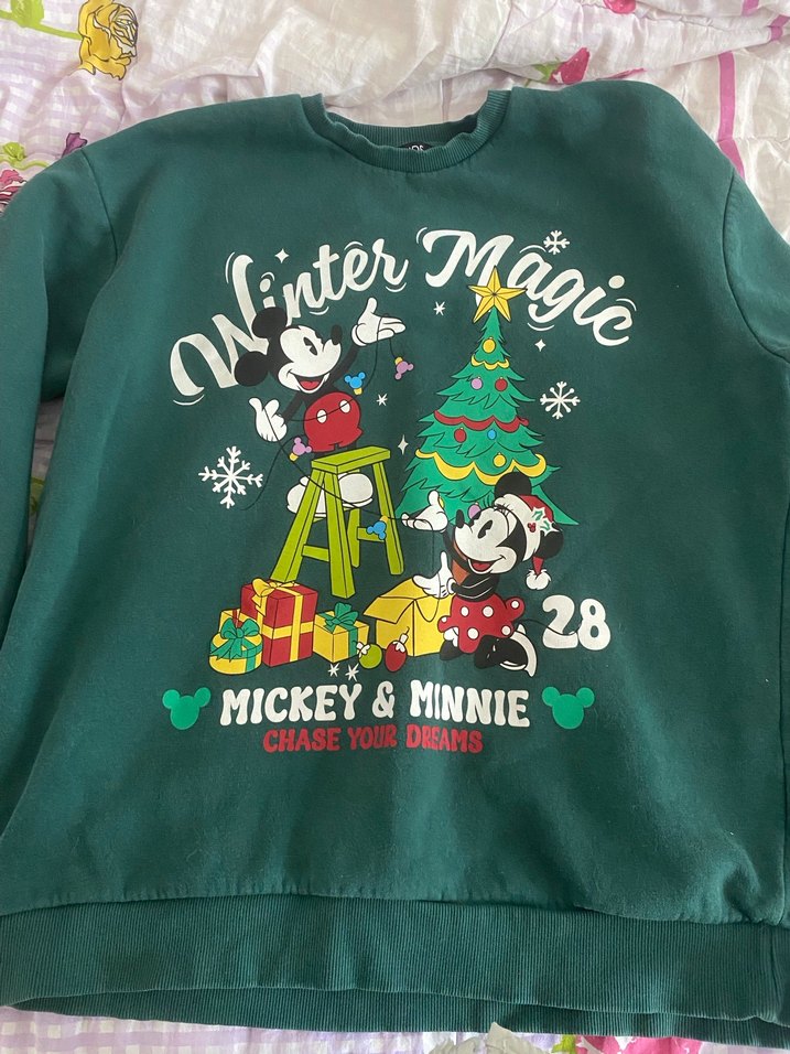 Yumuşak örme polar kumaştan üretilmiş, uzun kollu ve bisiklet yaka, bol kesim yeşil sweatshirt. Üzerinde Mickey ve Minnie baskısı ve kış temalı desenler bulunur. ❄️