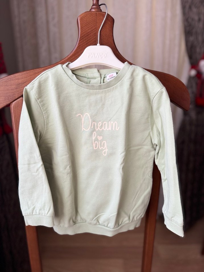 Kız çocuk yeşil sweatshirt, uzun kollu ve yuvarlak yaka. Yumuşak ve sıcak dokulu, örme kumaştan, "Dream big" baskılıdır. LCW marka 24-36 ay
