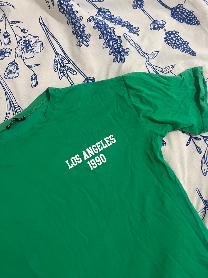 Rahat kesim, kısa kollu ve yuvarlak yakalı tşhrt Üzerinde renkli 'LOS ANGELES 1990' baskısı bulunur. Günlük kullanıma uygun tekstil kumaş.