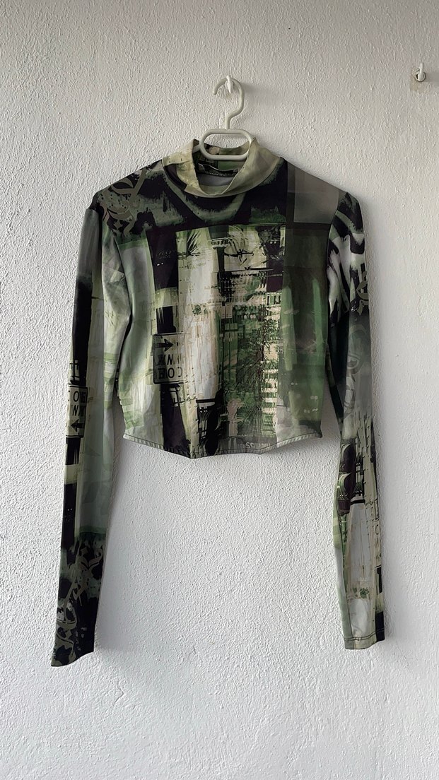 Dar kesim, kısa boylu bluz; yeşil ve gri tonlarda baskılı, transparan kumaştan, uzun kollu ve boğazlıdır.