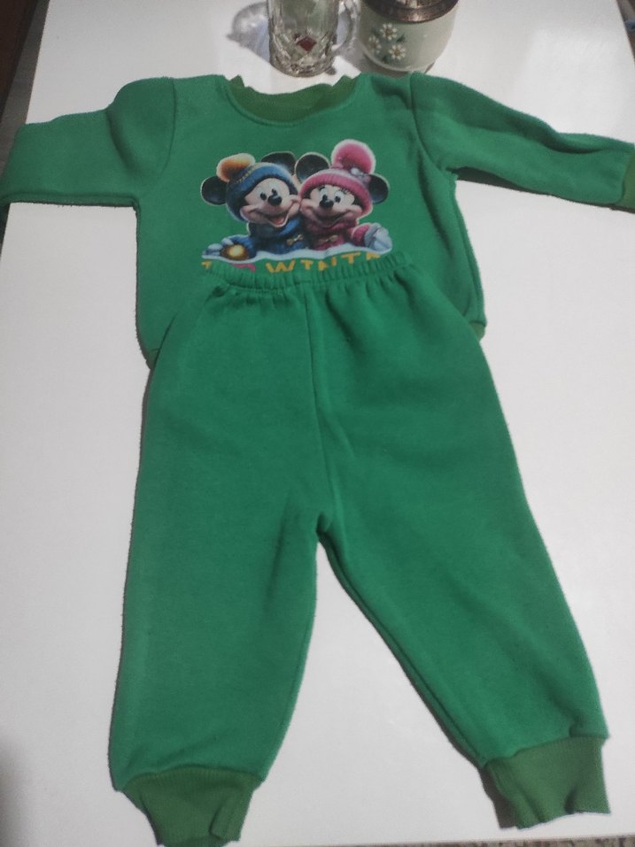 Yeşil renkli, baskılı ve triko dokulu çocuk takımı, uzun kollu ve bisiklet yaka, rahat ve şık bir görünüm sunar.