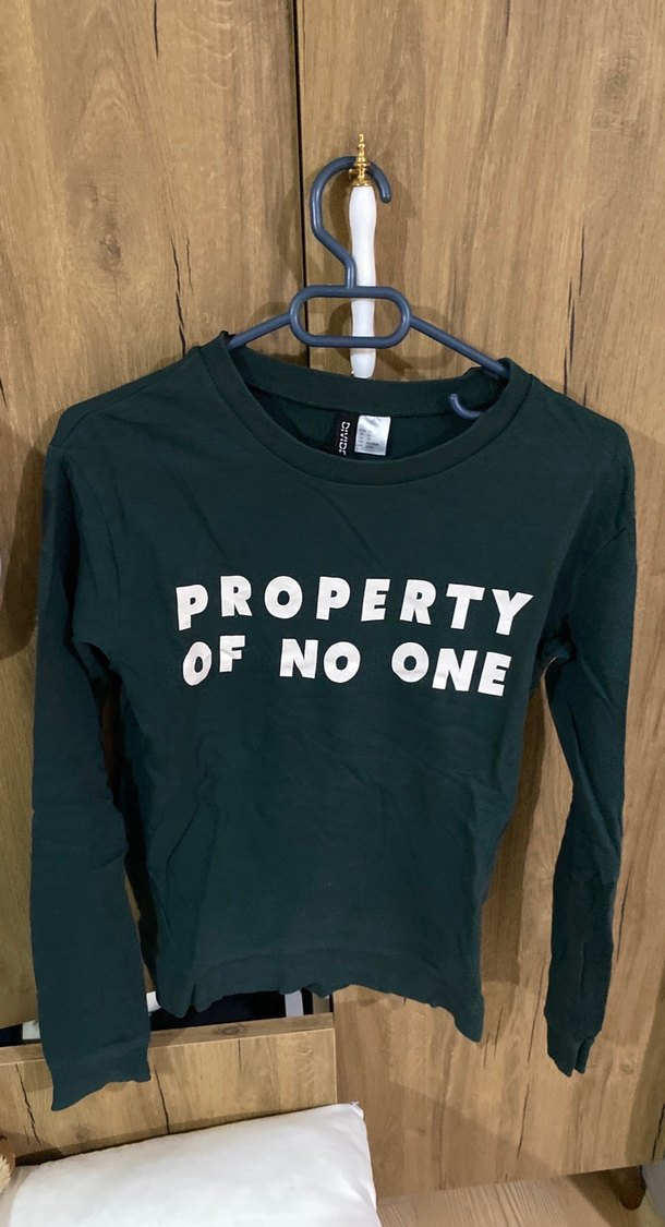Yeşil, baskılı sloganlı, uzun kollu ve bisiklet yaka, vücuda oturan kadın sweatshirtü. Günlük rahat kullanım için uygun, yumuşak dokulu kumaş.