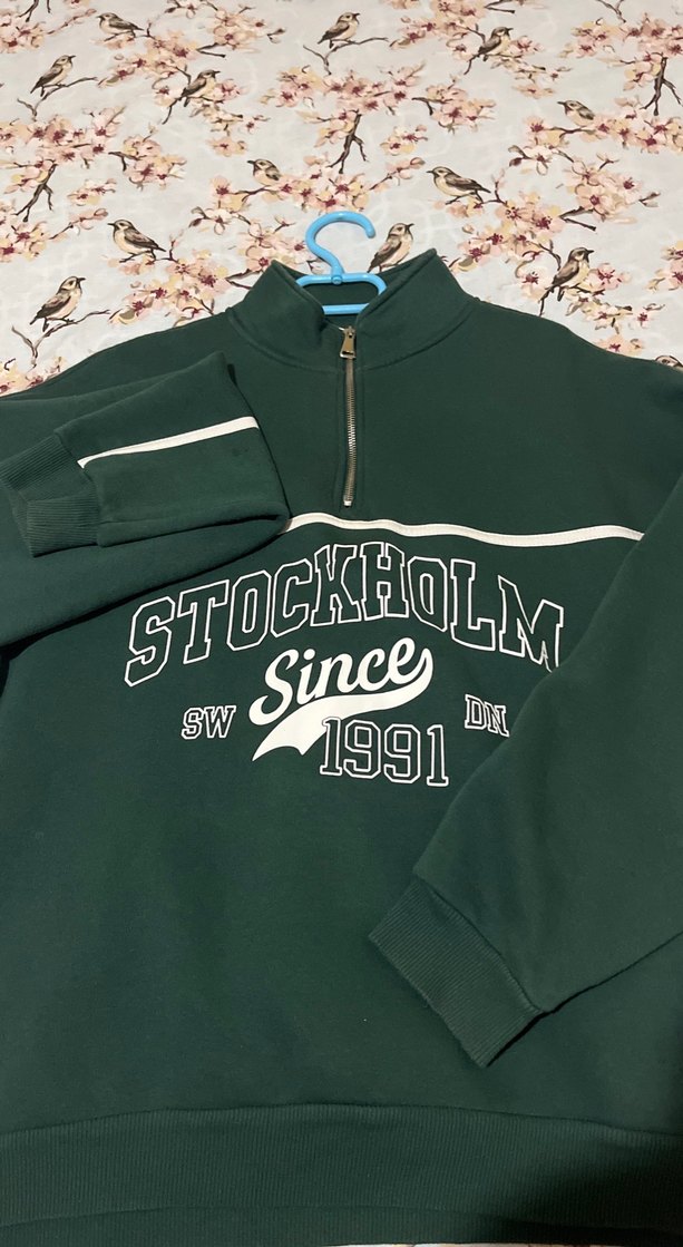 Yeşil renkte, parlak görünümlü, yarım fermuarlı boğazlı sweatshirt. Üzerinde 'Stockholm Since 1991' baskısı bulunur. Uzun kollu, bol kesim ve yumuşak kumaşlıdır.