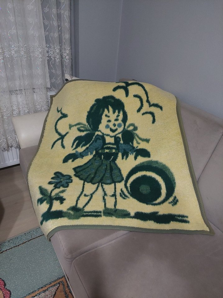 Koyu yeşil ve sarı renklerde, yün malzemeden yapılmış, baskılı çizgi film desenli çocuk battaniyesi. Sıcak ve yumuşak dokusu ile rahatlık sağlar. Dönem ürünüdür Uzun zamandır saklıyorum Bir deformesi yoktur Oldukça Yumuşak ve kaliteli bir üründür Boy uzunluğu 120 cm dir Eni ise 100 cm dir Hakiki yündür Açıklamayı dikkatli okuyup alım yapınız İade kabul etmiyorum