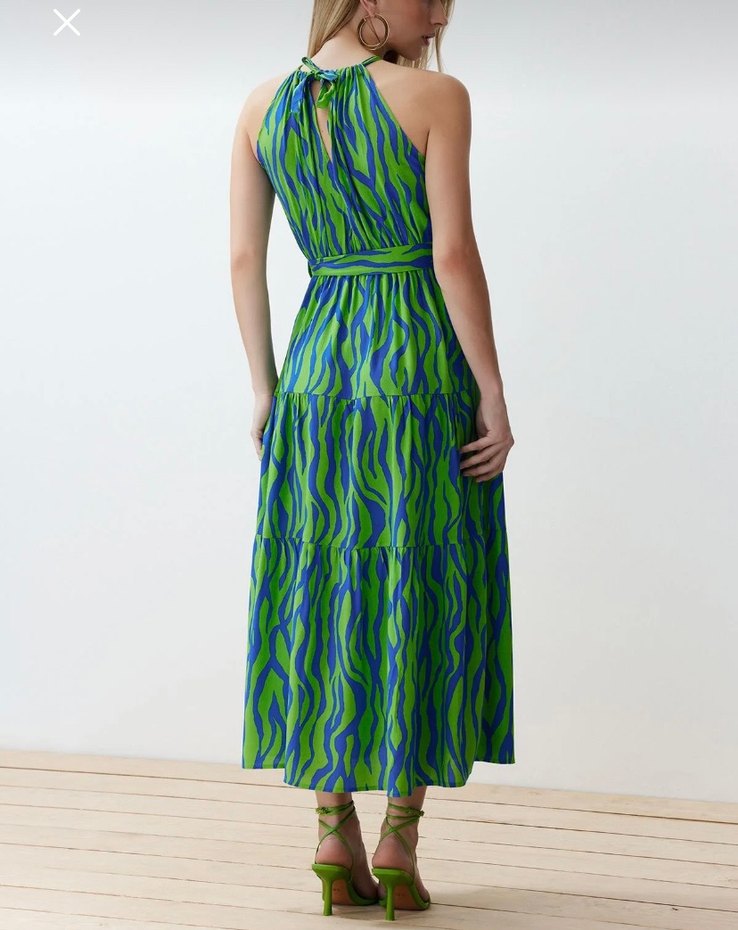 Yeşil batik desenli, elastik bel bantlı, sentetik kumaştan yapılmış, normal boyda, . Günlük kullanıma uygundur. Boyut 38. Beden 36-38-40 beden uyumlu çünkü beli lastıklı ve kuşaklı 1 kere giydim