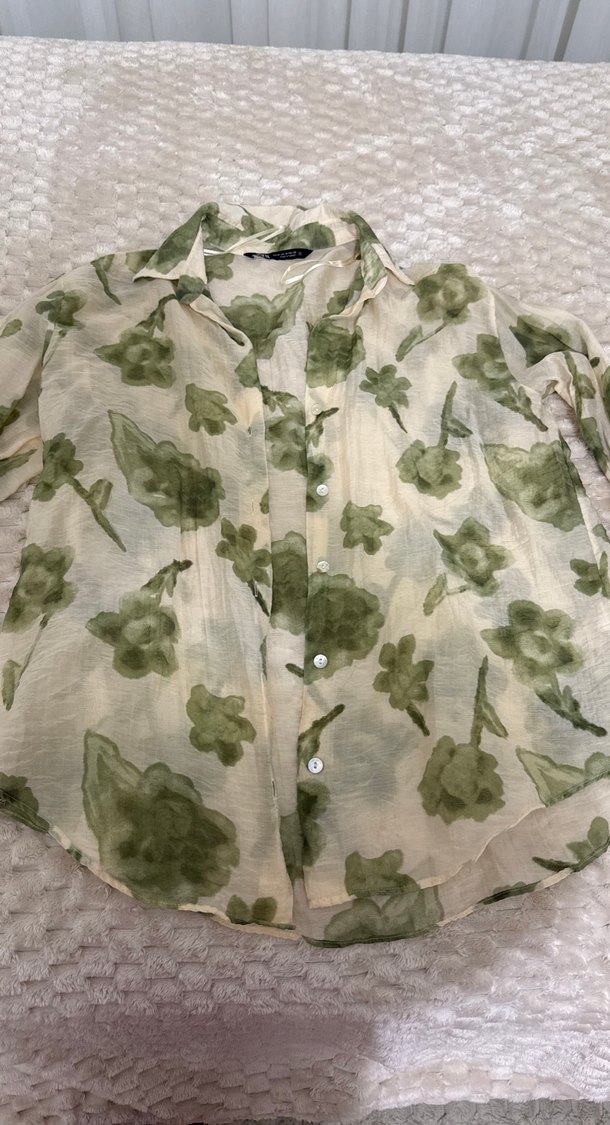 Yeşil batik desenli, keten kumaştan, düğmeli, kısa kollu, normal midi boyda bol kesim kadın gömlek. Bohem tarzı için uygundur.