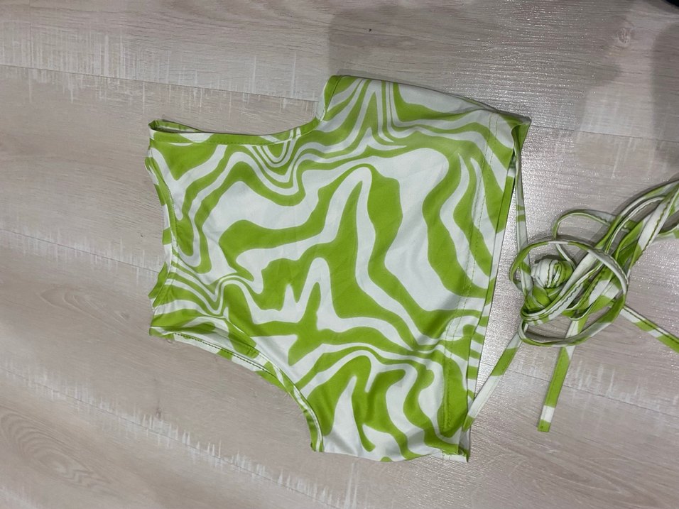 Yeşil batik desenli, askılı ve pileli detaylı, kısa kesim kadın krop dış mekan kullanımı için uygundur.