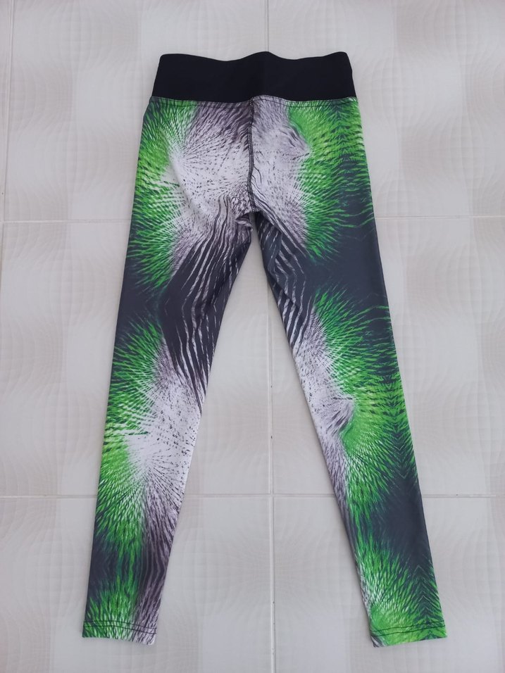 Elastik bel bantlı, yeşil batik desenli, midi boy, sentetik kumaştan sportif tayt. ♀️