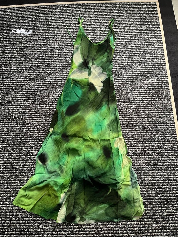 Bu yeşil batik desenli elbise, drapeli ve V yakalıdır. Kolsuz, bohem tarzda ve dar kesimlidir. Açık hava etkinlikleri için uygundur.