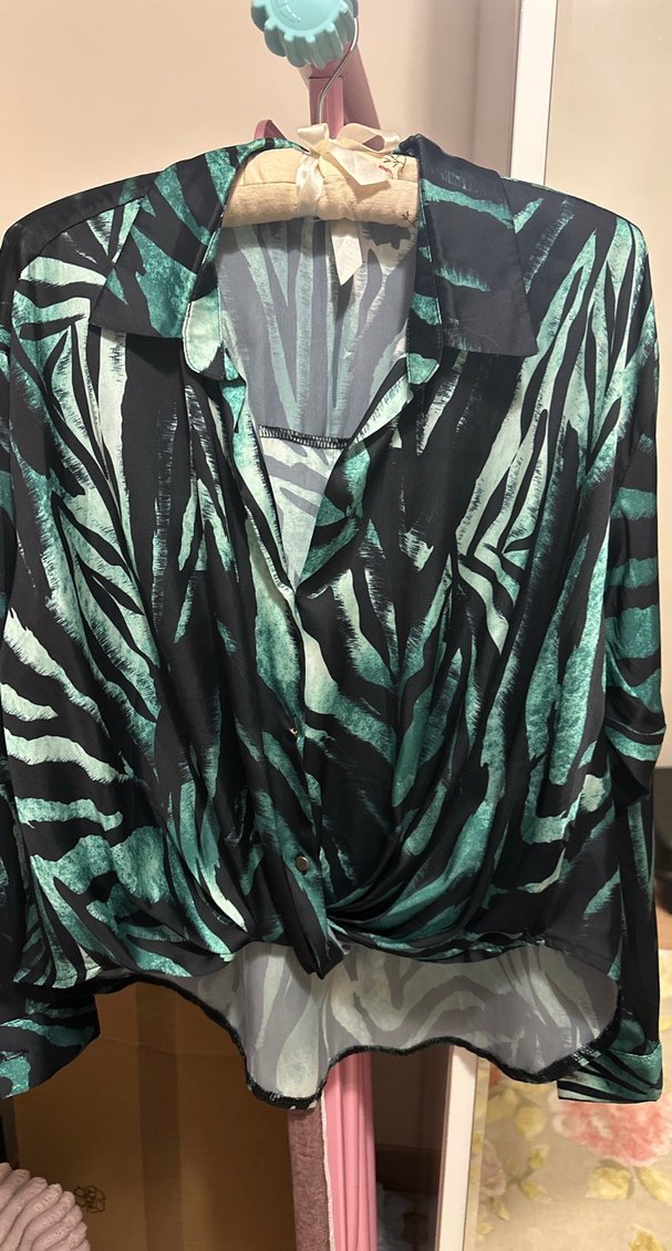 Uzun kollu ve bol kesim kadın gömlek, yeşil batik desenli ve V yakalıdır. Sentetik, yumuşak kumaştan, drapeli tasarıma sahiptir.
