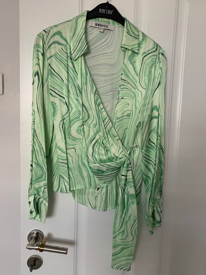 Yeşil batik desenli, v yaka, uzun kollu kadın gömleği. Dökümlü, bol kesim ve uzun boy ile çağdaş tarz sunar.