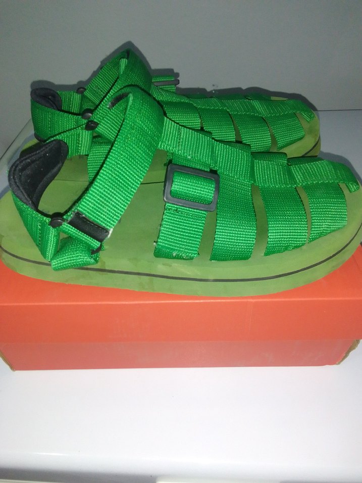 Yeşil renkli bayan sandaletler, dayanıklı kauçuk taban ve ayarlanabilir Velcro bantlara sahiptir. Canlı renkleri ve avangart stiliyle dış mekan kullanımı için uygundur.