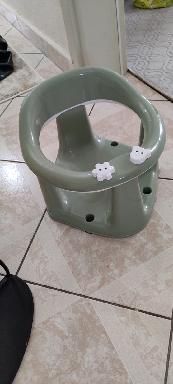 Yeşil renkli, kolay temizlenen yüzeye sahip, güvenli halka tasarımlı ve beyaz ayı figürlü detayları olan bebek mama sandalyesi.