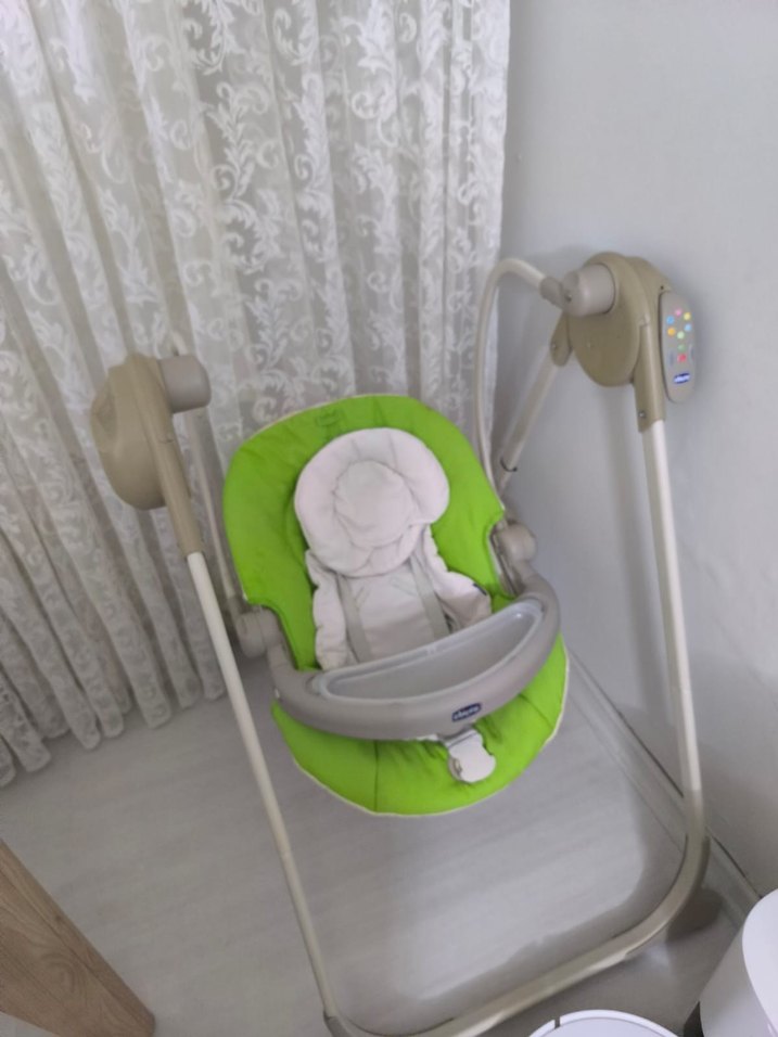 Yeşil renkli yumuşak minderli bebek salıncağı, gri çerçeve, emniyet kemeri ve kullanışlı tepsi ile birlikte. ürün üst kısım tentesi herşey mevcut ve çalışır durumda