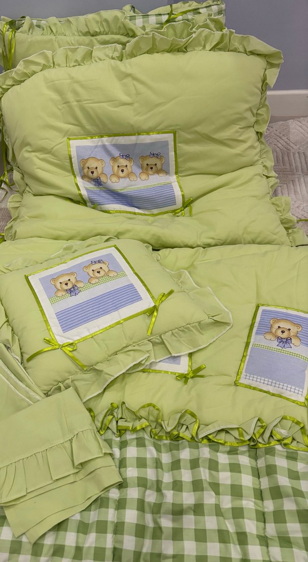 Ayıcık desenli, yumuşak ve rahat kumaştan yapılmış pastel yeşil bebek uyku seti, küçük bir yastık , yastık yüzü, çarşafı, yorganı, ve beşik koruyucuları mevcuttur.