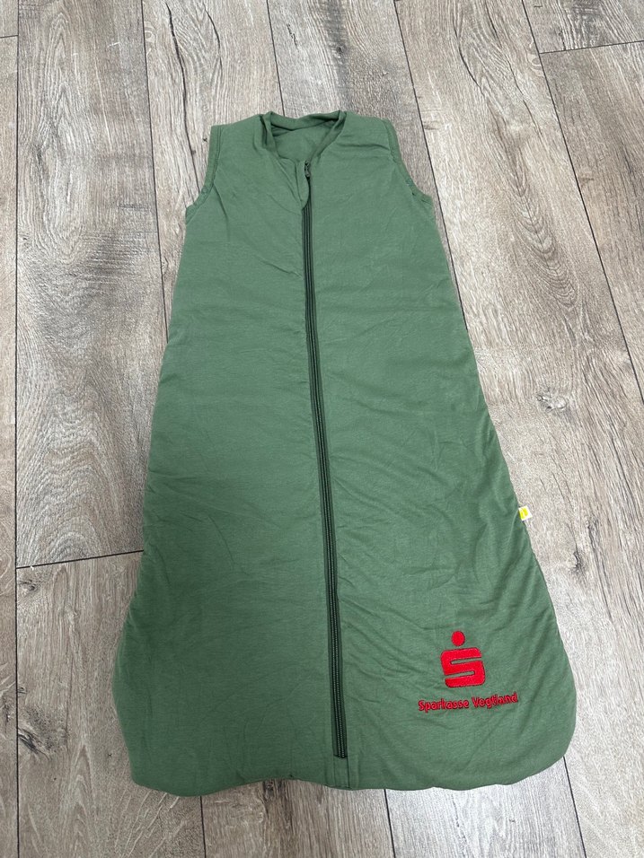 Önden fermuarlı, yumuşak kumaştan yapılmış yeşil bebek uyku tulumu, bebeklerin rahat ve sıcak kalmasını sağlar. Küçük logo detayı bulunur.