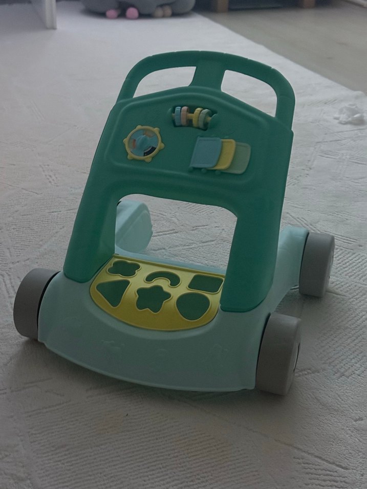 Yeşil renkte, sağlam tutma saplı ve oyun panelli bebek yürüteci, yürümeyi destekler ve eğlendirir.