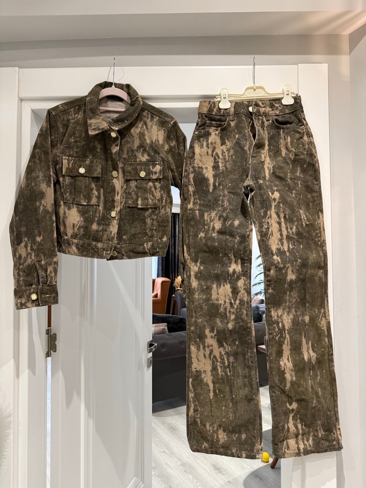 Yeşil,bej renklerde denim ve kadifemsi kumaştan, kamuflaj desenine benzer regular fit kesime sahip, kemerli ve notched lapelli uzun kollu ceket ile midi boy pantolon takımı. Sokak stili için uygun.