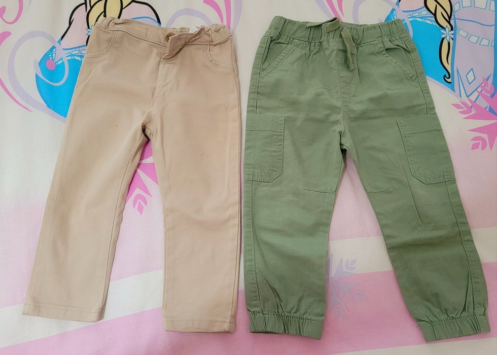 yesil ve Bej renkte pamuklu, bol kesim erkek çocuk pantolonu. Rahat ve şık sokak stili için uygun. keremde hafif leke var leke çıkarıcı ile denemedim