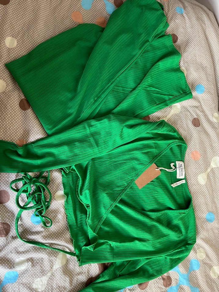 Kadınlar için yeşil renkte, yumuşak sentetik kumaştan sargı bluz, şık sokak modası için uygundur. Pantolon yüksek bel ve aşırı rahat bacak boyu uzun