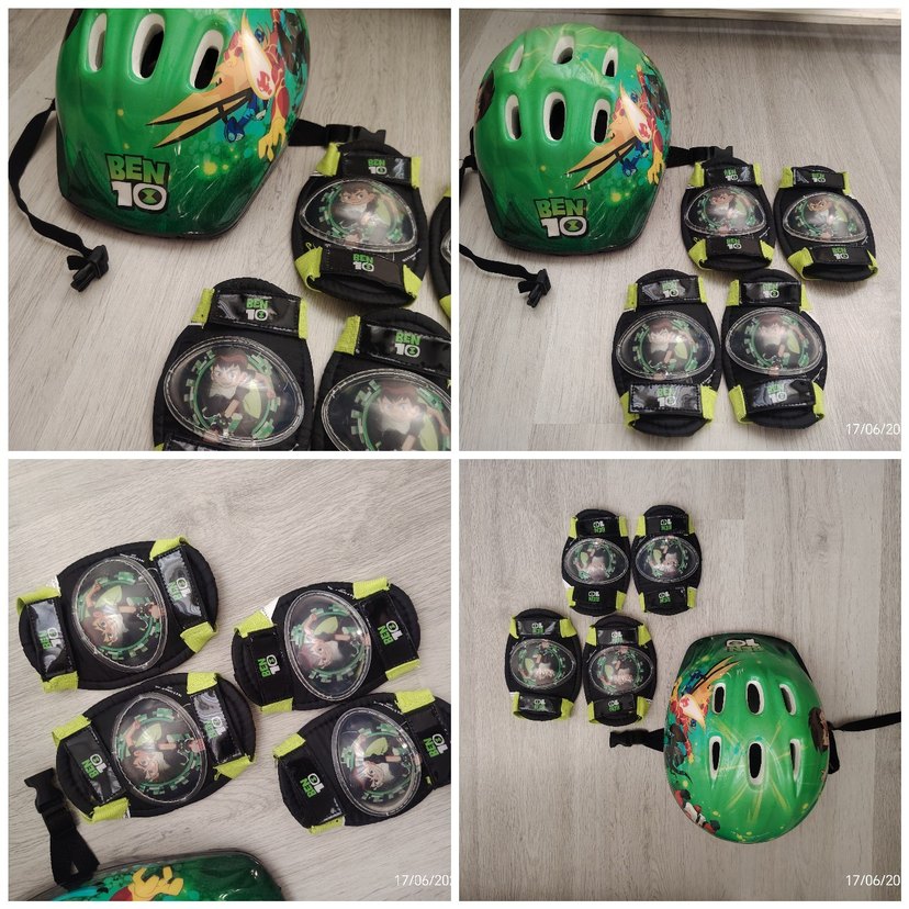 Yeşil renkli, Ben 10 temalı kask ve cırt cırtlı plastik koruyucu seti, yılan desenli ve renkli tasarıma sahiptir. ️