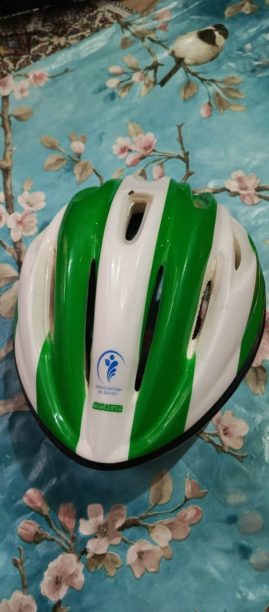 Dayanıklı plastikten yapılmış, yeşil beyaz baskılı bisiklet kaskı. Güvenli uyum için cırt cırtlı kayış içerir, athleisure tarzıyla uyumludur. ️