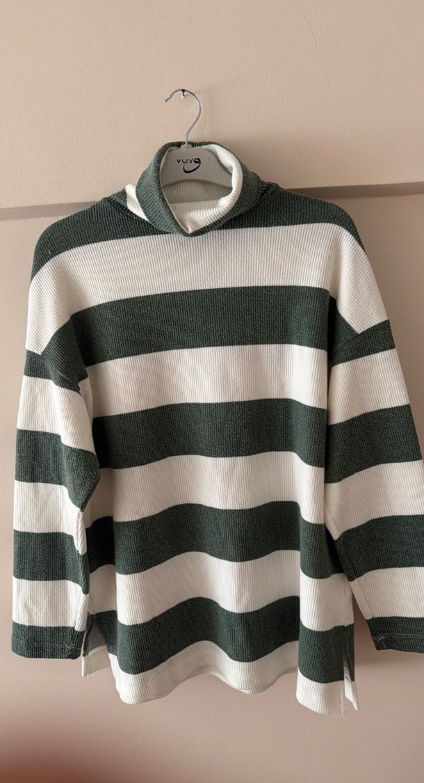 Boğazlı, uzun kollu, yeşil beyaz geniş çizgili örme kadın kazak. Rahat ve salaş kesimi günlük kullanıma uygundur.