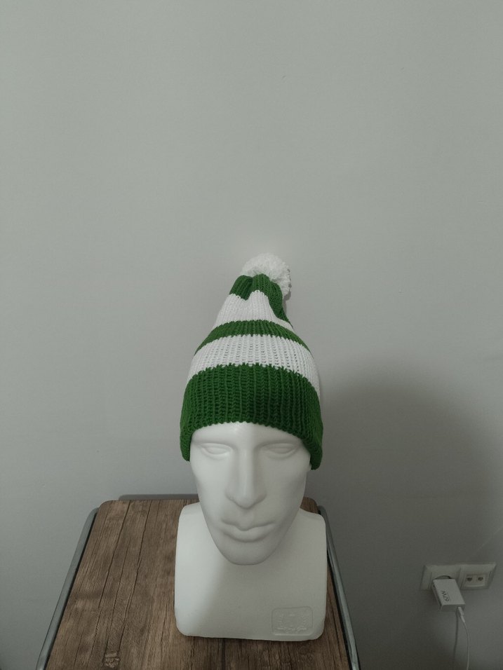 Kadınlar için yeşil ve beyaz çizgili, örgü yapıda, üstünde ponpon bulunan rahat bir bere. Bohem ve retro tarzına uygun.