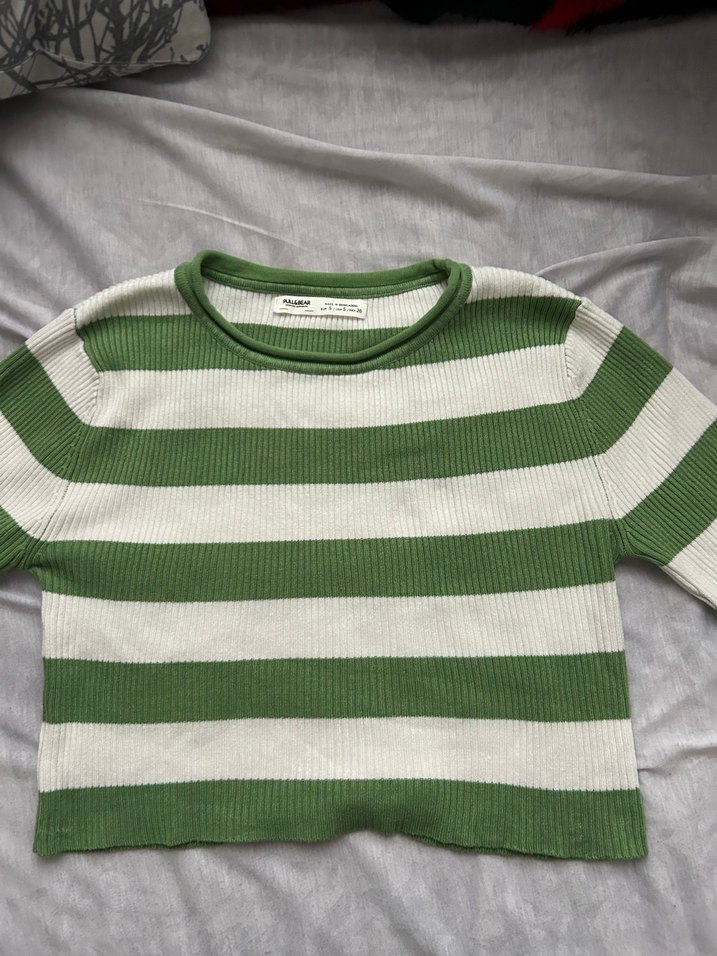 Pamuklu kumaştan, yeşil beyaz çizgili, bisiklet yaka ve uzun kollu, vücuda oturan kadın crop triko kazak . Günlük rahat kullanıma uygundur. Hiçbir sıkıntısı yoktur.