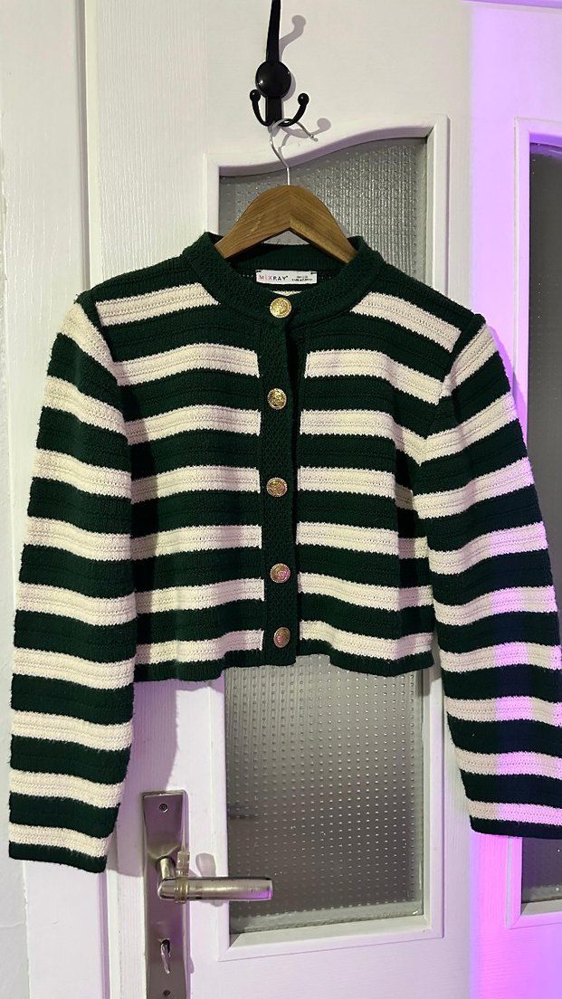 Fitted kesim, uzun kollu ve yuvarlak yakalı örgü hırka. Yeşil ve beyaz çizgili, düğmeli ve günlük kullanıma uygun normal boydadır. hiçbir sorunu yoktur temiz kullanılmıştır.