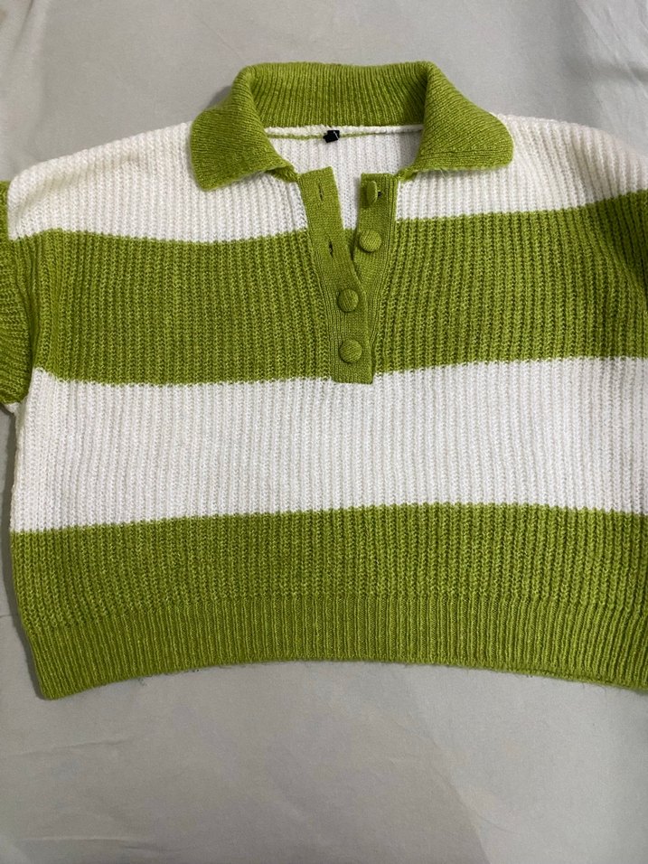 Örgü, yakalı ve uzun kollu bu kazak, açık yeşil ve beyaz çizgilerle tasarlandı. Salaş kesimi ve normal boyu ile günlük sokak stiline uygun.