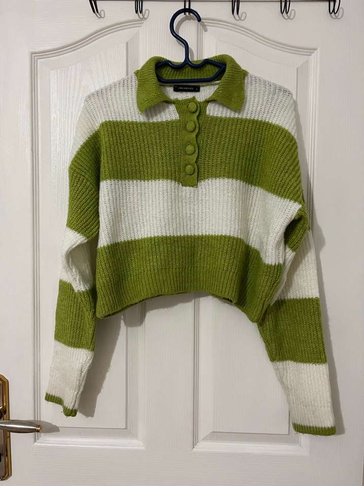 Uzun kollu, düğmeli yakalı örgü kazak, yeşil ve beyaz çizgili desenle gevşek kesim sunar. Günlük sokak stili için uygundur.