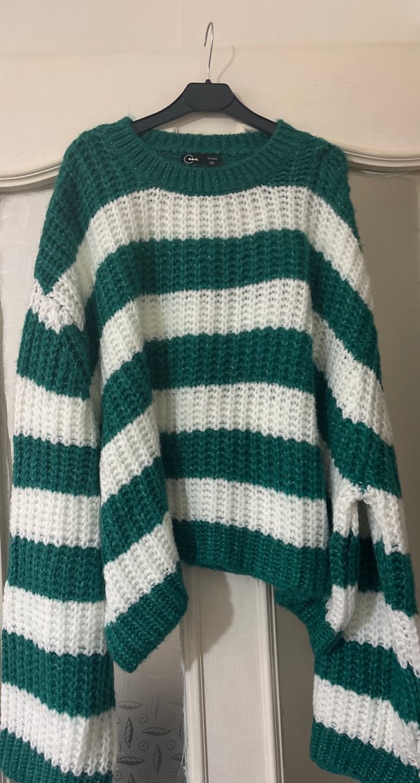 Yeşil ve beyaz çizgili, uzun kollu, yuvarlak yakalı, örgü kadın kazak. Bol kesim ve midi boyda, rahat sokak stiline uygun.