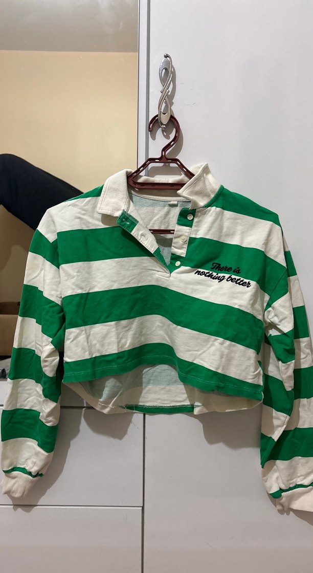 Yeşil ve beyaz çizgili, uzun kollu, pamuklu kadın sweatshirt. Düğmeli, yakalı ve bol kesimdir. Günlük kullanıma uygun rahat bir modeldir.