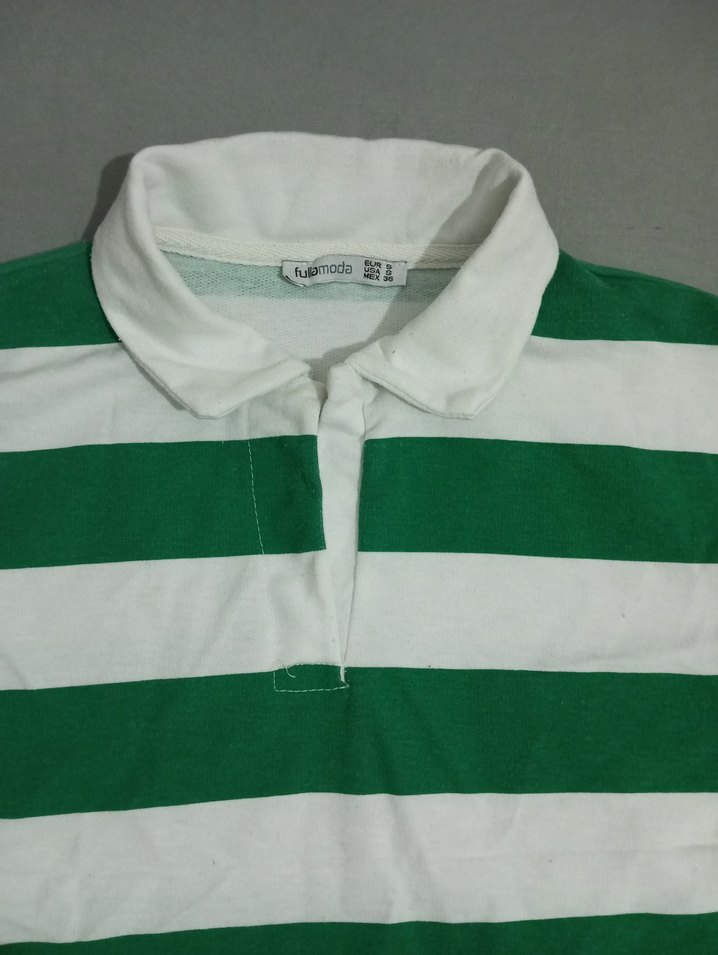 Fulla moda Pamuk kumaştan yapılmış, düğmeli yakalı ve uzun kollu, yeşil beyaz çizgili, vücuda oturan erkek polo tişörtü.