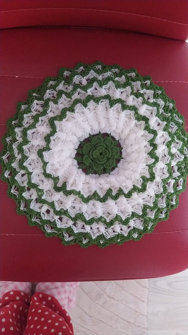 Yeşil ve beyaz renklerde, katmanlı desenlere ve çiçekli merkeze sahip dekoratif yuvarlak örgü örtü.