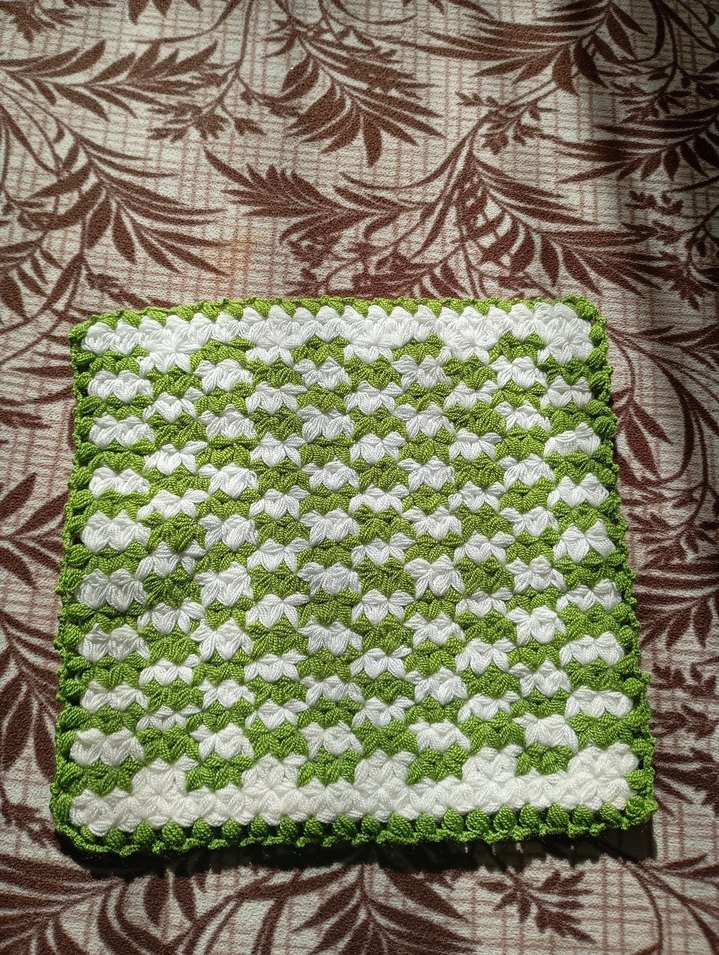 Açık yeşil ve beyaz renklerde, kare şeklinde örülmüş yumuşak dokulu banyo süngeri.