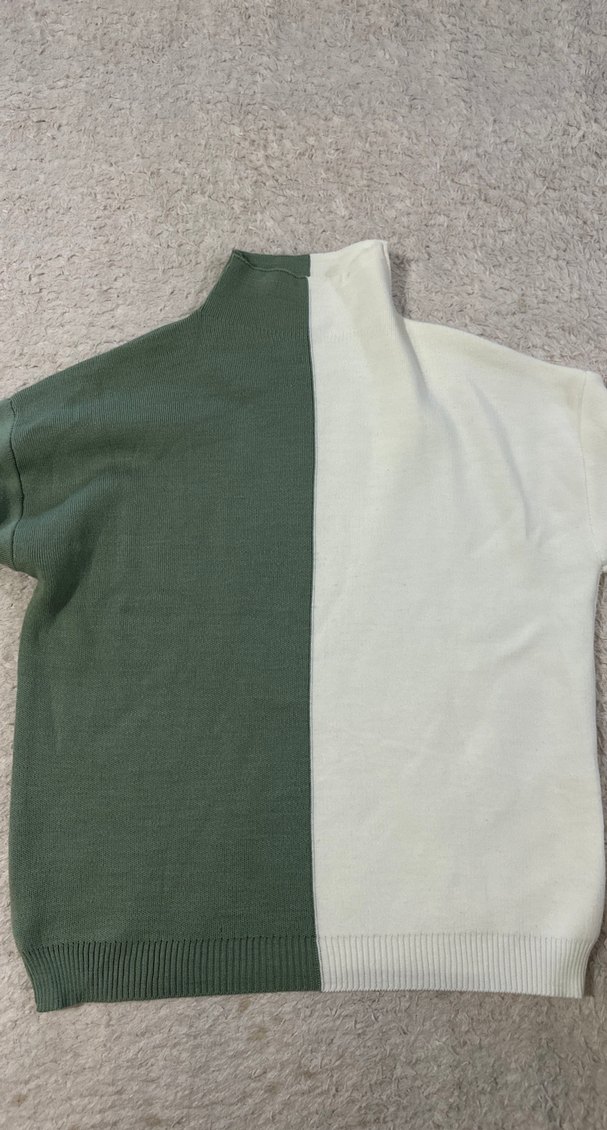 Pamuklu örme kumaştan, uzun kollu ve boğazlı, yeşil-beyaz renk ayrımlı, bol kesim triko. Rahat ve günlük stil için uygundur.