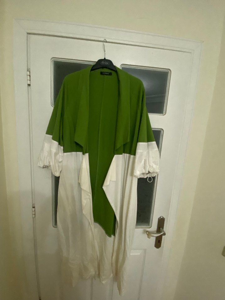 Uzun, salaş kesim kadın kap , uzun kollu ve yeşil-beyaz baskılı desene sahiptir. Minimalist sokak giyimi tarzında, açık renk tonlarında. Ürünüm Ceremony Markadır.Çok farklı ve cool bir tarzdır. 2 kere giyildi