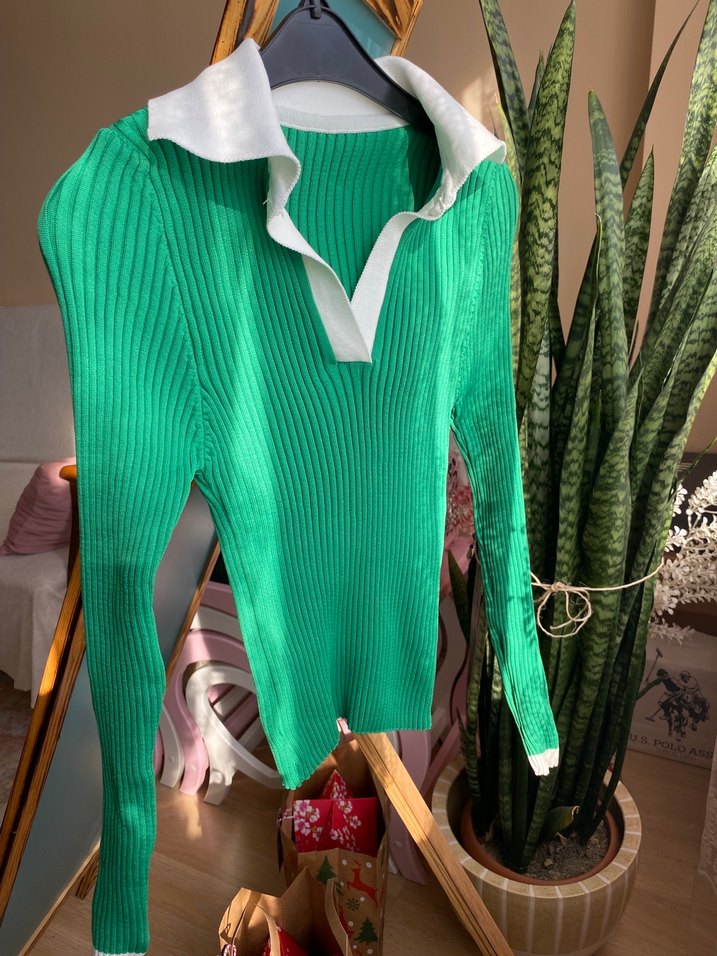 Yeşil Beyaz Yakalı Triko Kadın Kazak