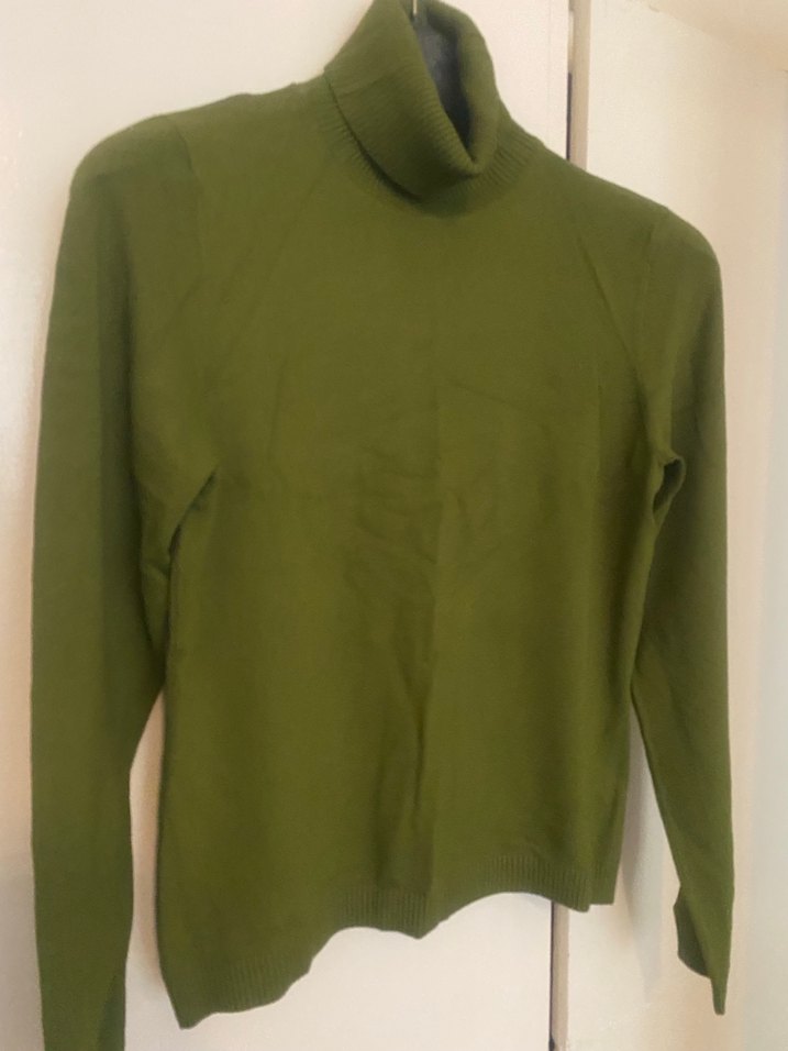 Yeşil boğazlı, uzun kollu ve yün kumaştan yapılmış kadın kazak, günlük kullanım için uygundur. Minimalist ve desen içermeyen tasarımıyla sokak stiline uyum sağlar. Hiç giyilmedi..