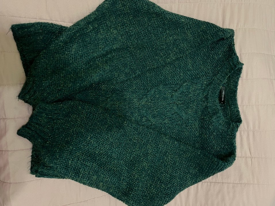 Bu yeşil parlak renkte, boğazlı ve uzun kollu kadın yün kazak, örme dokusuyla rahat ve günlük kullanıma uygundur. Midi boy ve vücuda oturan kesimlidir. M beden bir defa giyildi